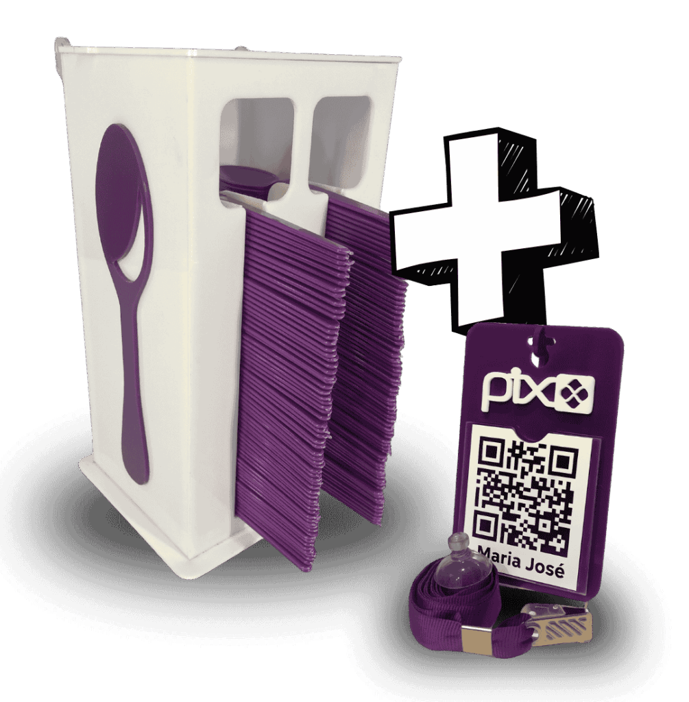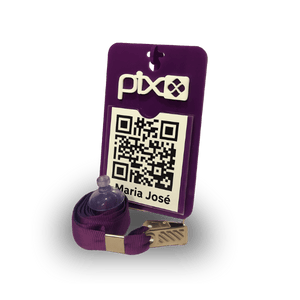 É uma peça de acrílico com espaço para o QR Code do Pix, podendo ser usado de três formas: pendurado no pescoço com cordão, preso com ventosa em superfícies lisas, ou apoiado com suporte para balcão/mesa.